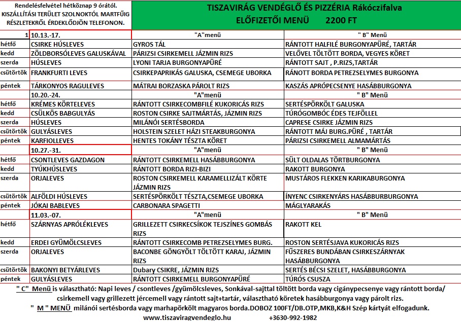 ELŐFIZETŐINKNEK (MINIMUM HETI 4 ADAG) RENDELÉSE ESETÉN A TOVÁBBIAKBAN IS 2200 FT AZ „A’ ÉS „B” MENÜ ÁRA.