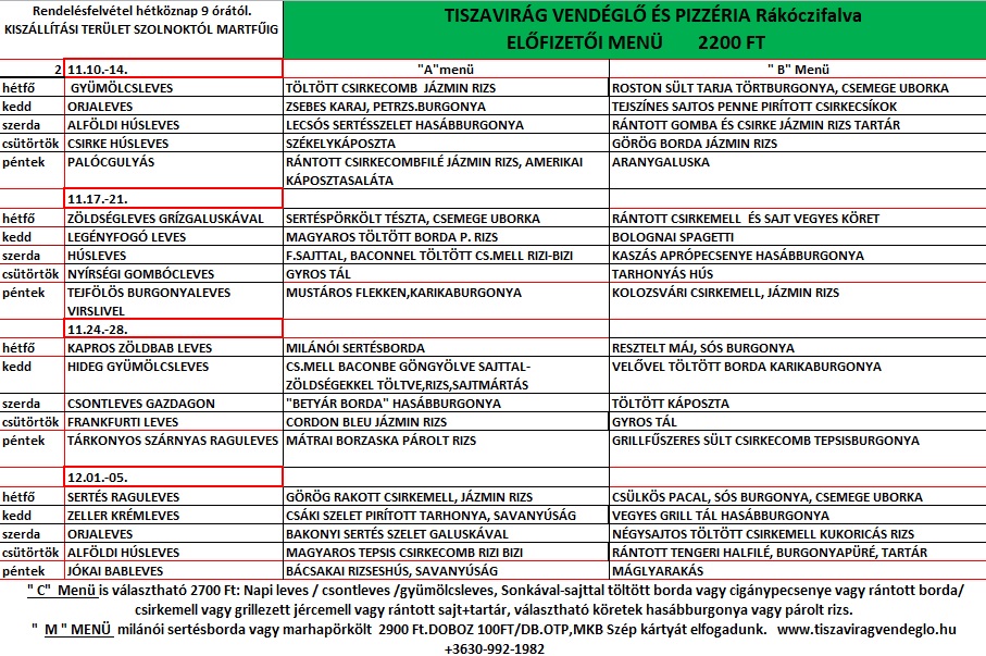 ELŐFIZETŐINKNEK (MINIMUM HETI 4 ADAG) RENDELÉSE ESETÉN A TOVÁBBIAKBAN IS 2200 FT AZ „A’ ÉS „B” MENÜ ÁRA.