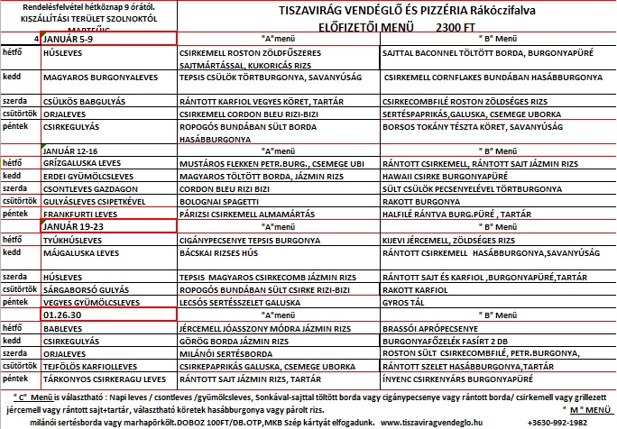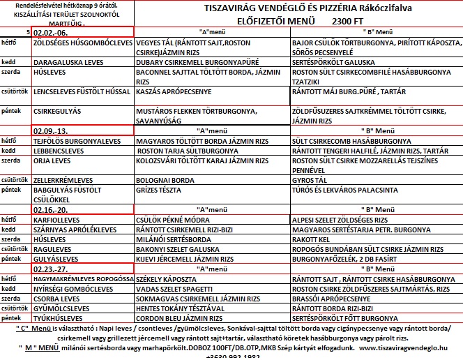 ELŐFIZETŐINKNEK MINIMUM HETI 5 teljes menü RENDELÉSE ESETÉN 2300 FT AZ „A’ ÉS „B” MENÜ ÁRA.