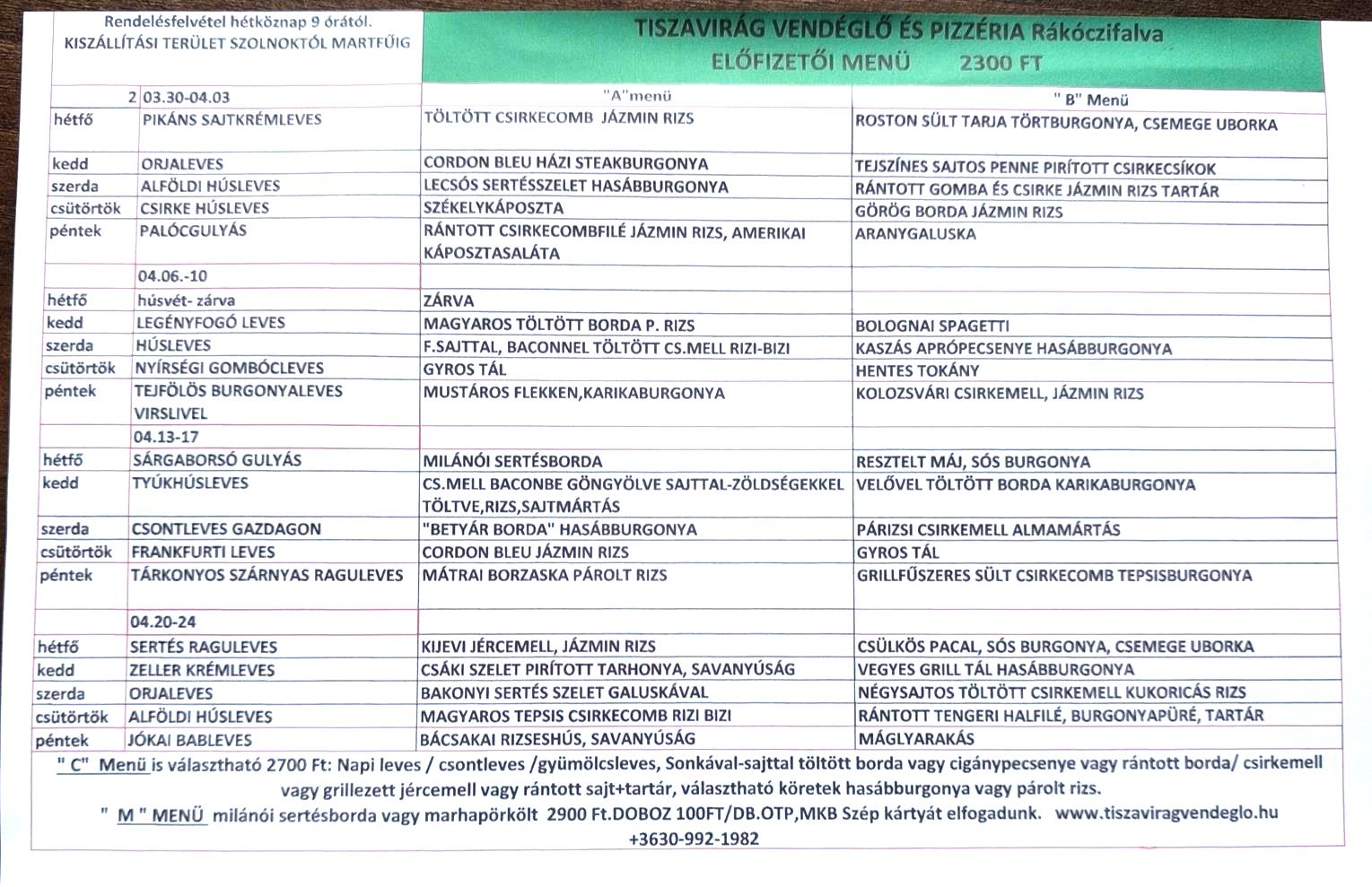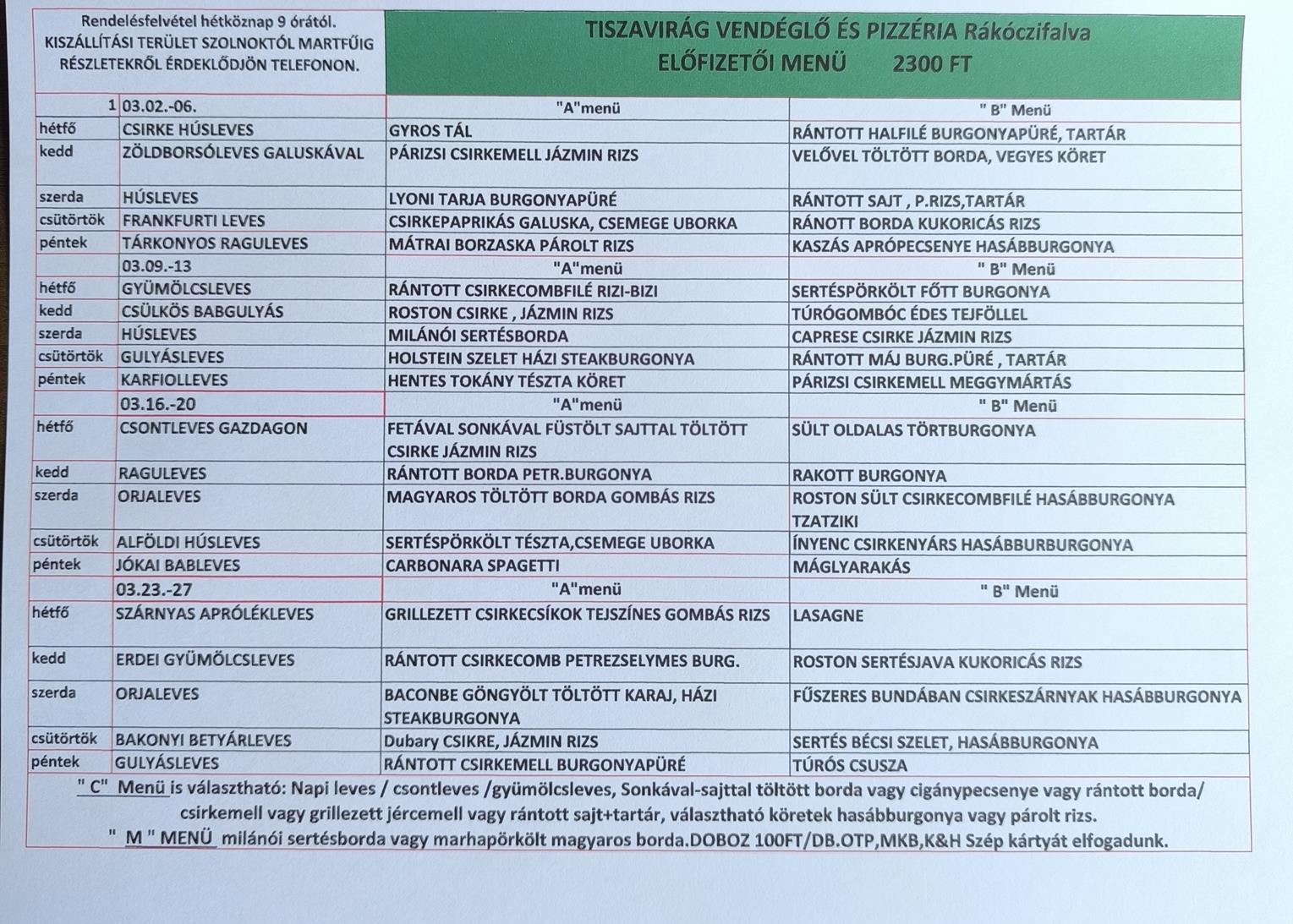 ELŐFIZETŐINKNEK MINIMUM HETI 5 teljes menü RENDELÉSE ESETÉN 2300 FT AZ „A’ ÉS „B” MENÜ ÁRA.